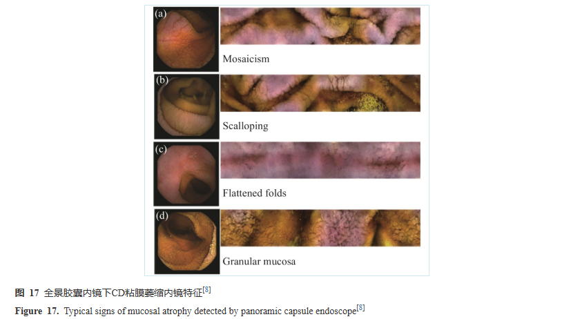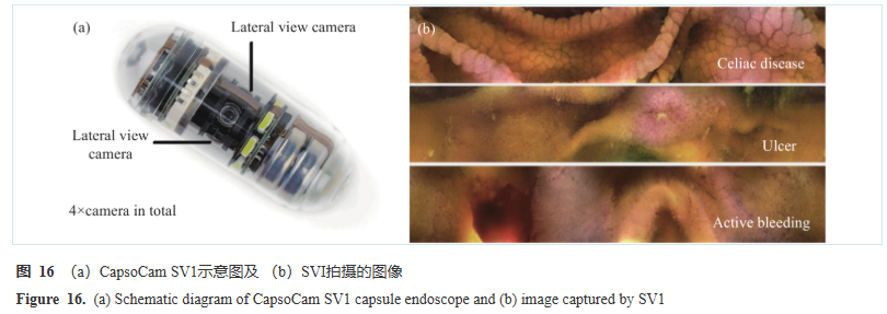 Capsule endoscopes are now extensively used and play an important role in diagnosing and treating conditions such as obscure gastrointestinal bleeding (OGIB), Crohn's disease, and complicated celiac disease. Figure 16(b) shows images captured by the CapsoCam SV1 for various common conditions, including celiac disease, ulcers, and active bleeding. In one comparative study between CapsoCam SV1 and PillCam SB3 involving 153 patients with OGIB, the results showed that the SV1, with its panoramic view, could observe richer pathological information and detect more cases of bleeding. Regarding physician satisfaction, 95% were satisfied with the capsule system and assessment software, while treatment-related adverse events/serious adverse events were 17.9%/1.3%. Overall, patient acceptance of the SV1 was high, indicating broad application prospects in outpatient settings. In the diagnosis and management of Crohn's disease, using the panoramic-view CapsoCam SV1, physicians observed numerous erosions and ulcers from the distal duodenum to the terminal ileum in patients suspected of having Crohn's disease, suggesting practical improvements in lesion classification and differential diagnosis. Based on these features, the patient was diagnosed with extensive small bowel Crohn's disease and improved with specific treatment. For celiac disease, using the SV1 effectively detected small bowel atrophy, showing good sensitivity and specificity compared to histology. Figure 17 shows an image of the small bowel area in a CD patient taken with the SV1, capable of detecting four endoscopic features of mucosal atrophy, providing significant guidance for diagnosing CD.