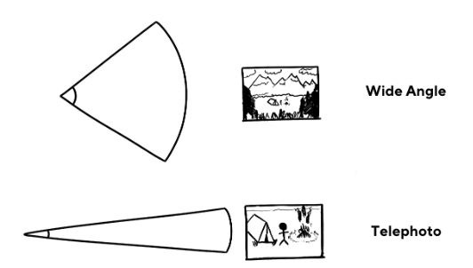 Lenses with a shorter focal length (lower number in mm) will be able to capture a wider scene and are typically referred to as wide-angle lenses. Longer focal lengths (a higher number in mm) are often referred to as telephoto lenses and will provide greater optical magnification and the ability to capture images from greater distances.